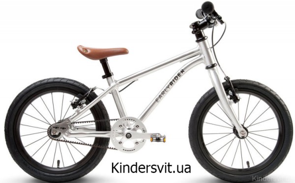 Early Rider Велосипед Belter 16 Urban aluminium. Данный велосипед, наверное, самый сложный по разработке. Вес велосипеда 5,5 кг. Нужно учитывать тот факт, что каждый килограмм веся велосипеда для 3-летнего ребенка является эквивалентом 4-5 кг для взрослого. Велосипед Belter 16 Urban в среднем на 5 кг легче его 16 дюймовых аналогов, что сильно играет роль для ребенка! Преимущества велосипеда не только в весе, но и в самом крутящем механизме. Вместо привычной цепи, которая имеет свойство растягиваться и разбрызгивать грязь, в данной модели велосипеда используется приводной ремень. Диаметр колес: 16". Для детей возрастом от 3,5 до 6 лет (рост от 105 см, длина ноги от 45 см). Рама зачищена и покрыта лаком вручную. Модернизированные алюминиевые звездочки. Короткий передний и задний V-образный ручные тормоза. Кованый алюминиевый шток. Специально разработанные компанией Early Rider педали. Длина кривошипа 105 см. Победитель: Eurobike Award 2012 и Red Dot Product Design Award 2013. Минимальная высота сидения: 47 см. Максимальная высота сидения: 57 см. Вес: 5,65 кг. Поставляется в практически собранном виде, остается прикрутить педали и руль. Гарантия: 12 месяцев. Производитель: Early Rider (Великобритания)