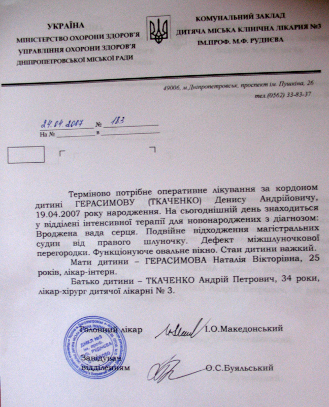 Перед вами Денис Герасимов – маленький человечек, который совсем недавно пришел в этот мир. Еще задолго до своего рождения он полюбил маму Наташу и папу Андрея, для которых был очень долгожданным ребенком. Он слышал их голоса и очень хотел их поскорее увидеть. Наверное, день рождения Дениса стал самым счастливым для его родителей. Но счастье продлилось недолго. Когда мама приложила кроху к груди, его тельце неожиданно посинело. Малыша срочно повезли на УЗИ, результаты которого больше походили на приговор: врожденный порок сердца, двойное отхождение магистральных сосудов от правого желудочка, дефект межжелудочковой перегородки, функционирующее овальное окно. Крохе срочно необходима операция, которая даст шанс на счастливое детство, полное стольких открытий, радости, смеха, любви… Но все имеет свою цену. Предварительно стоимость операции, которую будут делать в Кракове или Варшаве, оценивается в 15 тысяч евро. Эту сумму сложно назвать астрономической – многим деткам нужно в десятки раз больше. Но у Андрея с Наташей ее просто нет. Оба Денискиных родителя – врачи с зарплатой в 500 грн. Андрей, детский хирург, столько раз спасал жизни новорожденных, оперировал все, кроме сердца. Теперь он сам со слезами в глазах рассказывает о своем дорогом, единственном сыночке. И только от нас с вами зависит, превратятся ли эти слезы в слезы радости.