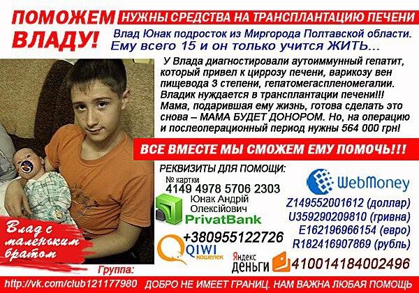 У Влада диагностировали аутоиммунный гепатит, который привел к циррозу печени, варикозу вен пищевода 3 степени, гепатомегаспленомегалии. Владик нуждается в трансплантации печени!!!Донором будет мама. Без трансплантации печени, врачи дают неутешительные прогнозы (от 3 до 5 лет), но если сделать операцию есть большой шанс на длинную и практически полноценную жизнь. Приблизительная сумма, озвученная врачами, которая нужна на операцию и послеоперационный период 564 000 грн! Для семьи из маленького города это сумма просто неподъемная, поэтому без нашей помощи, ДРУЗЬЯ, они не справятся!... У каждого в сердце живет доброта, только за суетой современного мира мы не успеваем добротой этой делится, так давайте остановимся на секундочку и поможем, кто как сможет Владику!!! Поверьте, даже самые маленькие суммы порой могут спасти ЖИЗНЬ! Добавляйтесь в группу и рассказывайте о нас друзьям, мы благодарны за то, что не остаетесь равнодушными!!!