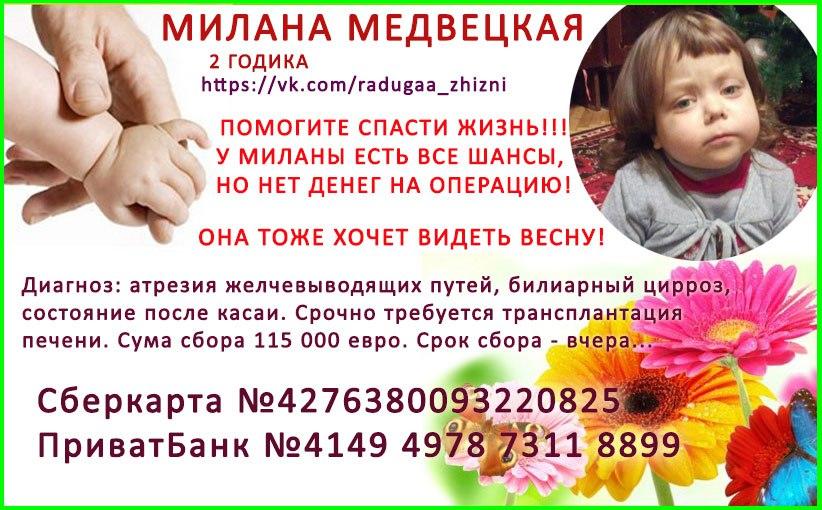 У Миланочки страшная болезнь! Которая не ждет! Увы, время как всегда не в нашу пользу! Врачи оценивают состояние как стабильно тяжелое - малышке необходимо провести операцию! Состояние Миланы не стабильно, анализы прыгают от средних до критических, билирубин очень высокий...Каждый день это борьба! Борьба аз жизнь маленькой девочки.